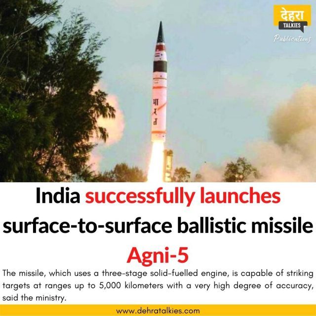 India has successfully launched the surface-to-surface ballistic missile, Agni-5, that can strike targets at ranges up to 5,000 kilometers with a very high degree of accuracy.