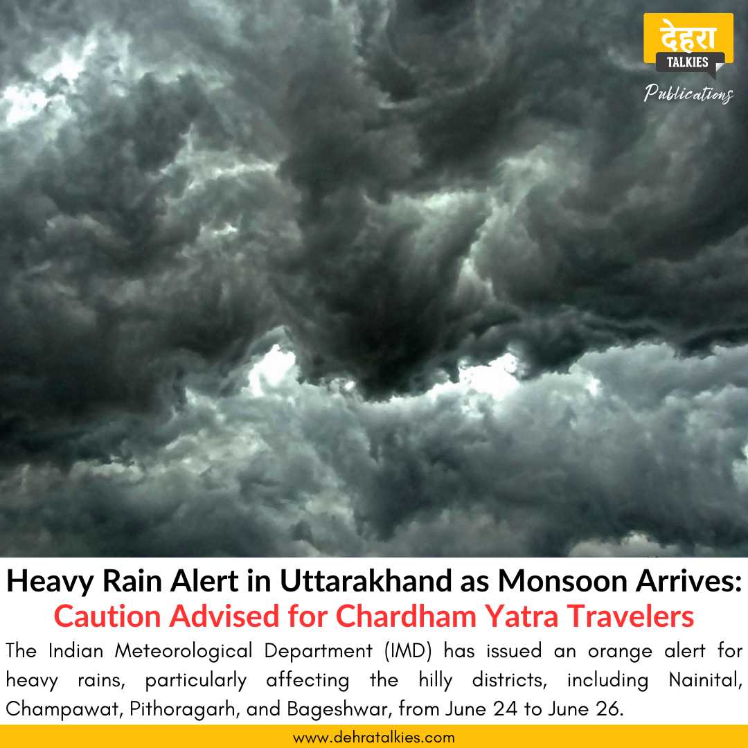 A heavy rain alert has been issued across Uttarakhand as the monsoon is set to arrive, posing potential challenges for the thousands of devotees undertaking the Chardham Yatra. The Indian Meteorological Department (IMD) has issued an orange alert for heavy rains, particularly affecting the hilly districts, including Nainital, Champawat, Pithoragarh, and Bageshwar, from June 24 to June 26.