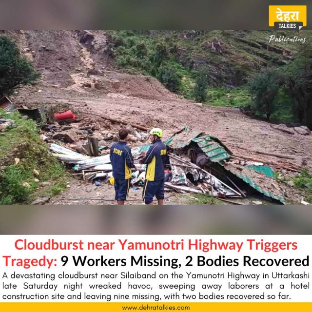 A cloudburst near Silaiband, between Paligaad and Ojri Dabarkot on the Yamunotri Highway, led to massive destruction around midnight on Saturday. The incident has left at least nine laborers missing, while two bodies have been recovered from the banks of the Yamuna River, 18 kilometers downstream near the Tiladi Shaheed Memorial.