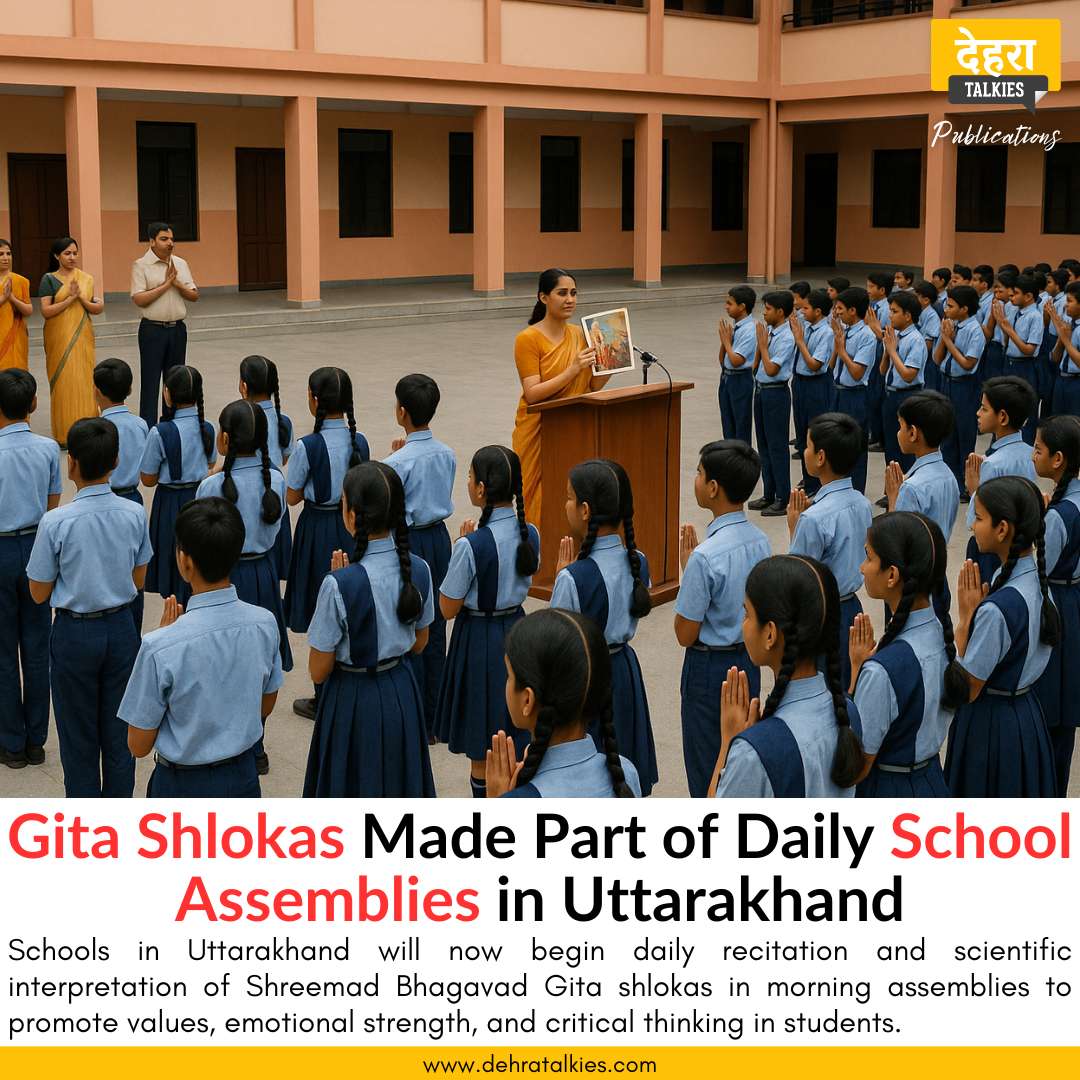 Starting today, all government and aided schools across Uttarakhand will include the recitation of Shreemad Bhagavad Gita shlokas during their morning assemblies. As per a directive issued by Director of Secondary Education Dr. Mukul Kumar Sati, students will not only listen to one shloka each day but also understand its meaning and scientific relevance.